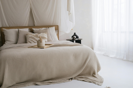 Una de las grandes tendencias es el uso de tejidos reciclados, una elección cada vez más presente en la moda del hogar, que no solo busca la estética, sino también un impacto ambiental mínimo. Otros tejidos como el lino, jacquard y el waffle están ganando popularidad por su capacidad para añadir textura y profundidad a las camas.